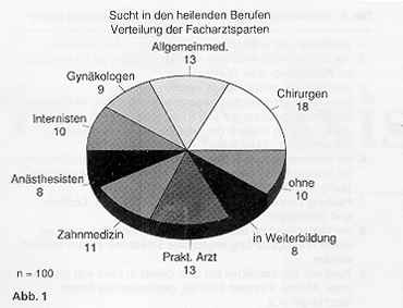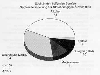 Die Geschlechtsverteilung zeigte 83 Kollegen und 17 Kolleginnen, die betroffen waren. Bezüglich der Altersgruppierungen waren 34 % zwischen 20 und 40 Jahren, 51 % zwischen 41 und 60 Jahren sowie 15 % älter ais 60 Jahre. Familienstandsmäßig waren die meisten, männlich 50%, verheiratet. 17% waren ledig sowie 16% geschieden. Die meisten Kollegen und Kolleginnen hatten eine Facharztausbildung abgeschlossen. 79% waren Gebietsärzte/innen und nur 13% ohne Gebietsbezeichnung. Unter den Gebietsärzten fanden sich am häufigsten die Chirurgen mit 18 %, gefolgt von den Allgemeinmedizinern mit 13 % sowie den Internisten mit 10 % (Abb. 1). Etwas über die Hälfte, nämlich 52% der untersuchten Gruppe, waren in eigener Praxis tätig, weitere 13 % in leitenden sowie 19 % in nichtleitend angestellten Positionen und 16 % im Ruhestand. Von großem Interesse erschien uns die Untersuchung des Missbrauchs- bzw. Abhängigkeitsmusters. Die von den erkrankten Kollegen/innen am häufigsten missbräuchlich eingenommene Substanz war Alkohol mit 43%. Es folgte die Kombination von Alkohol- und Medikamentenmissbrauch/ abhängigkeit im Umfang von 34 %. Lediglich 10% der betroffenen stationär Behandelten nahmen Substanzen, die dem Betäubungsmittelgesetz (BTM) unterhegen, ein (vgl. Abb. 2). Dass die Sucht-,,Karriere” auch für Medizinalpersonen chronisch und progressiv ist, zeigte sich bei der Untersuchung von Frequenz und Intensität früherer Behandlungen. Hier gaben fast 2/3, nämlich 63 % frühere, z.T. auch wiederholte Entgiftungen an. Nur ein knappes Drittel der von uns Untersuchten hatten bereits eine Entwöhnungsbehandlung im engeren Sinne erfahren. Gemäß unserem Konzept der intensiven Kurzzeittherapie zeigten die Gruppen bezüglich der Behandlungsdauer folgende Aufteilung: 7 % waren bis zu 1 Woche in stationärer Behandlung, 15% 1-4 Wochen, jeweils 25% 5-6 sowie 7-8 Wochen, 17% 9-12 Wochen sowie lediglich 11% länger als 12 Wochen. Wichtig ist hierbei darauf hinzuweisen, dass die Behandlungsdauer bei uns Entgiftung und Entzug bei der Mehrzahl der Behandelten umfaßte. 46% der abhängigkeitserkrankten Kollegen/innen wurden somit in der Oberbergklinik mit einer Gesamtbehandlungszeit im Bereich bis zu 6 Wochen therapiert.